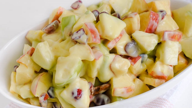 Përshesh me kos dhe mollë. 2-3 kokrra mollë grihen në rende, ose priten në copa të vogla, duke i shtuar më pas kosin. Përsheshi shoqërohet me sallatë mikse me perime për 3 ditë rresht. Pas 3 ditësh, shtohet edhe 200 gr. fileto pule deri në fund të dietës.